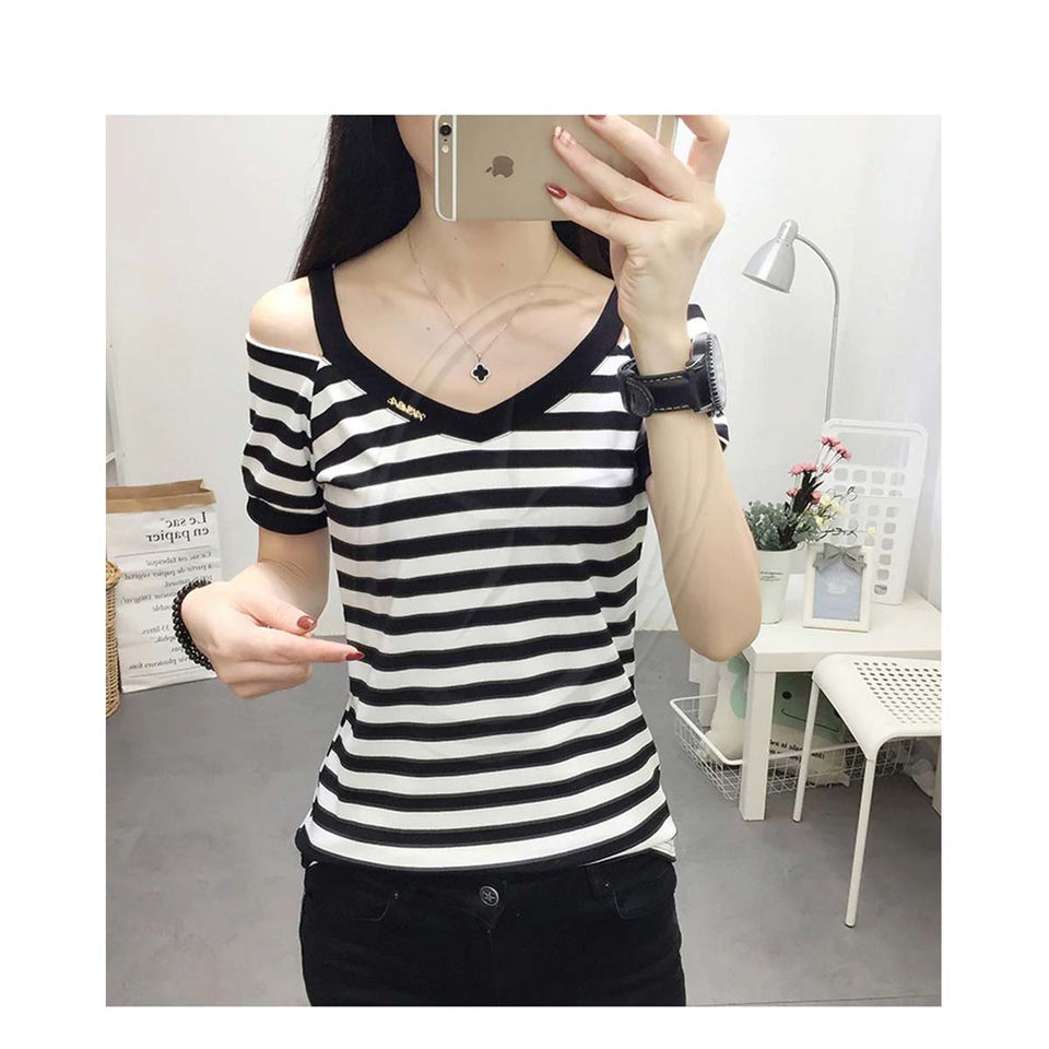 Off Shoulder Black Women T Shirts Striped Tee Shirt Femme Summer Korean Fashion Casual V-Neck T Shirt Women Short Sleeve