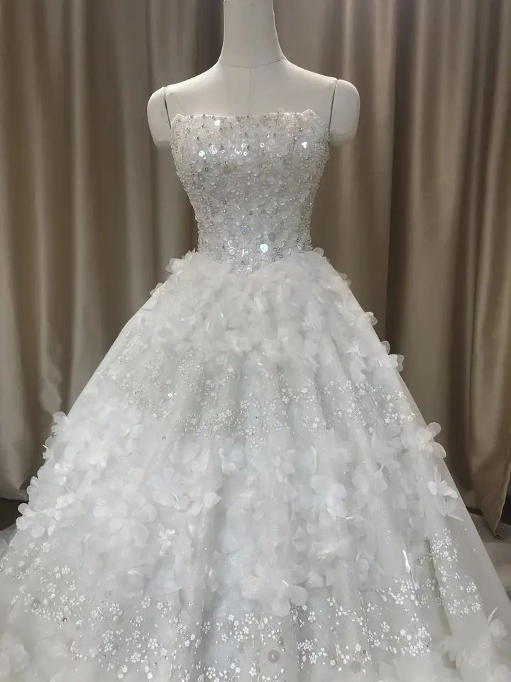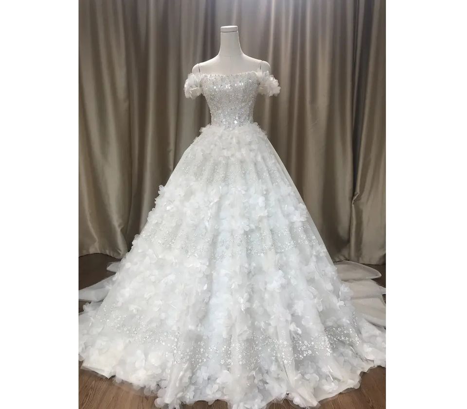 Off Shoulder Bride Gown White Lace Long Train Bridal Tiered Lace Ball Gown Modern Wedding DressesTNBPno35