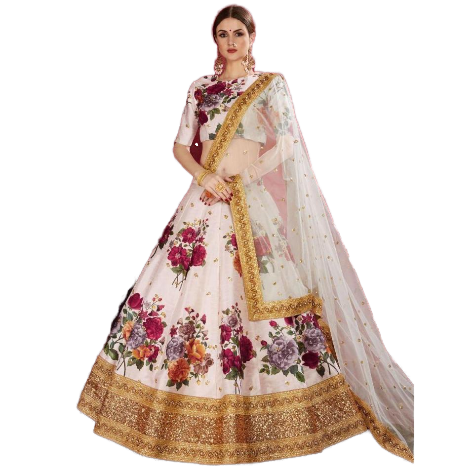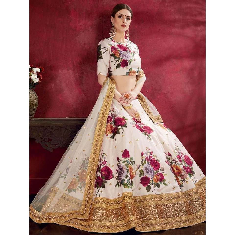 Off-White Floral Print Banglori Silk Evening Dresses Wedding Wear Lehenga Choli