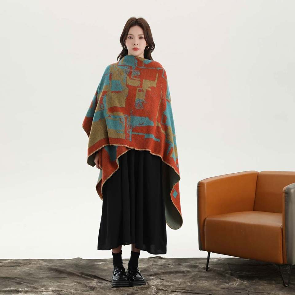 Oil Painting Style Argyle Graffiti Square Orange Color Thickening Warm Reversible Windproof Shawl Outdoor Female Travel Photo