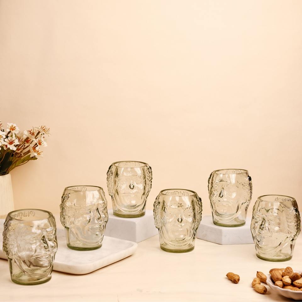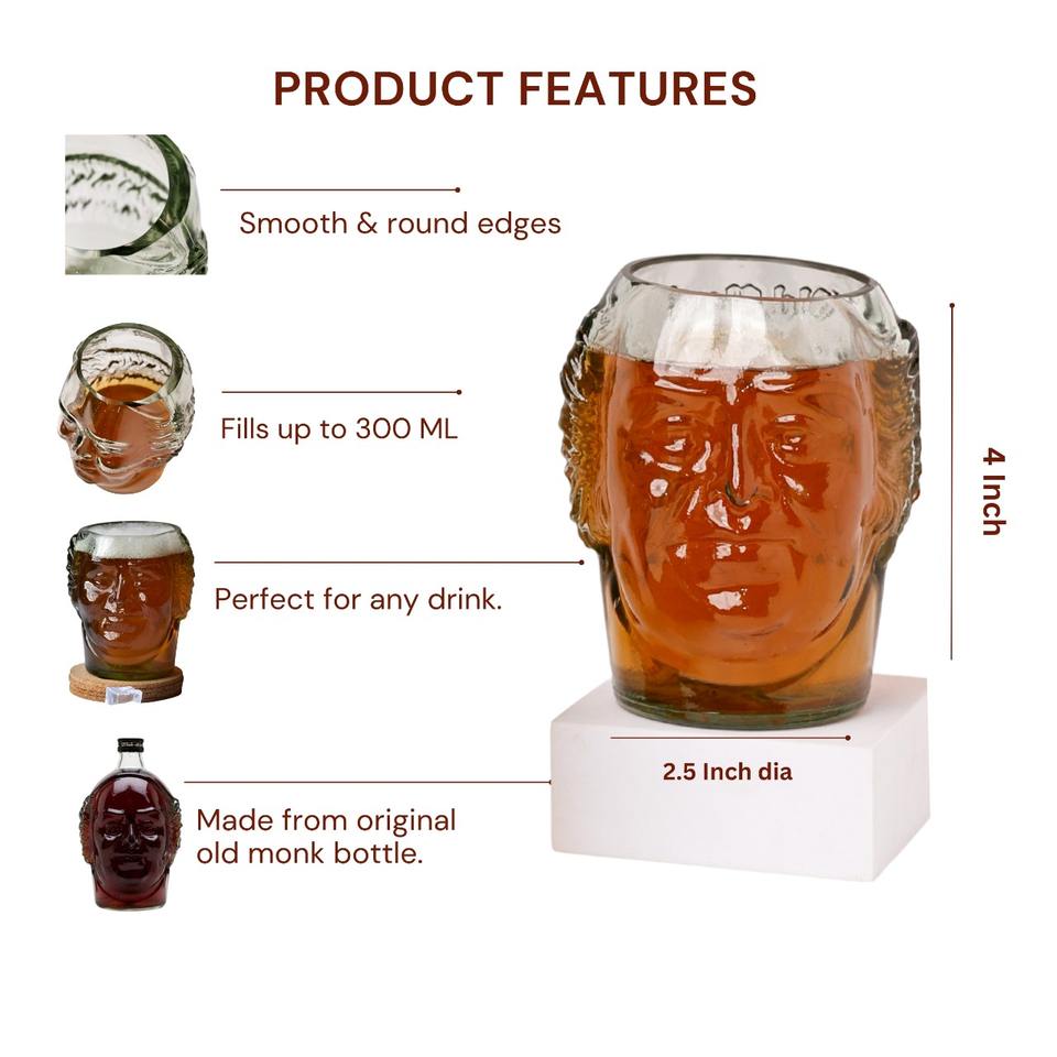 Old Monk face Vintage Leak Proof Smart Reusable eco friendly Glass Set of Six Liquor Bottle for Cocktails Juices Desk Use