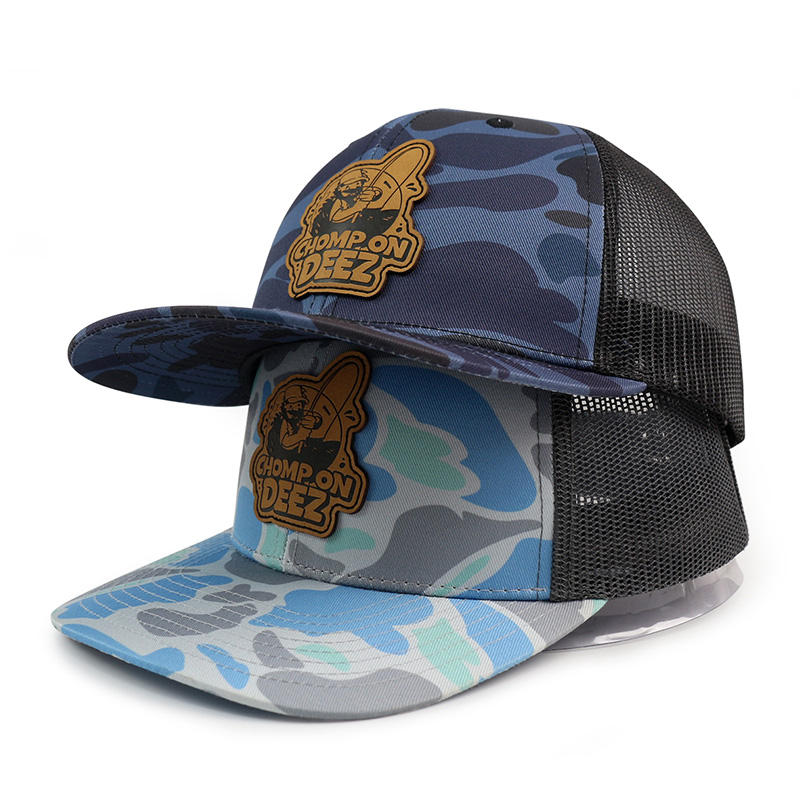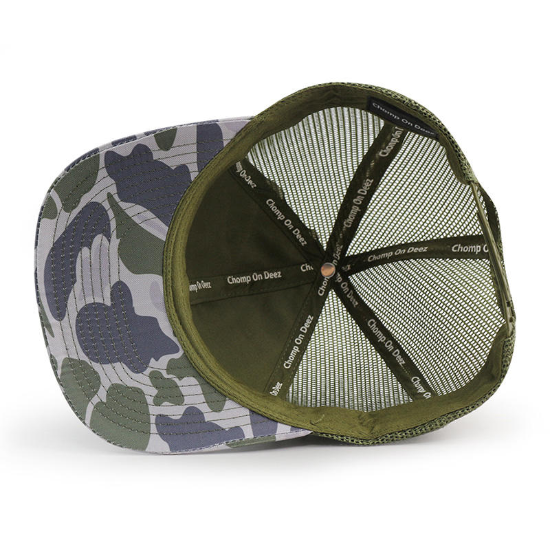 Old School Camou Trucker Hat Leather Patch Logo Woodland Camo Trucker Hats 6 Panel Camouflatge Gorras Mesh Back Trucker Hat Caps