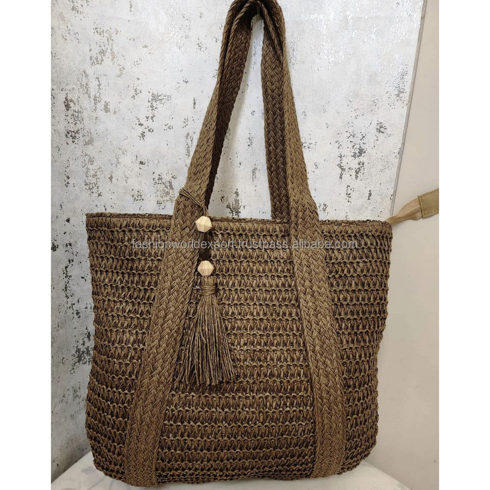 Olive Green Raffia Tote Bag with Braided Handles Handwoven Straw Shoulder Purse with Decorative Tassel & Wooden Beads Boho Style