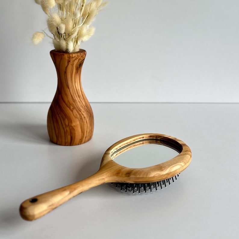 Olive Wood Wall Art Mirror Personalized Handheld Brush Rustic Natural Wooden Comb Eco Friendly Hanging Birthday Gift Him Her
