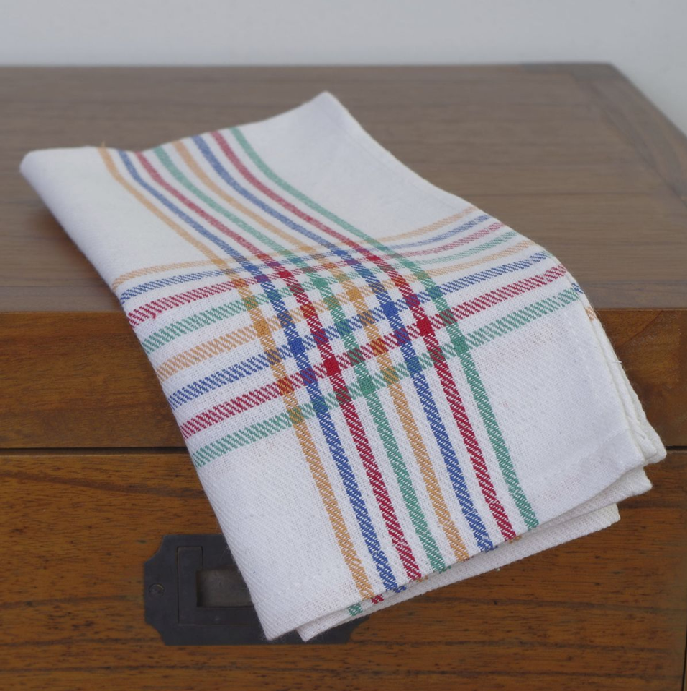 Olive, yellow, red, narrow-stripe cotton kitchen towel, available at wholesale prices.