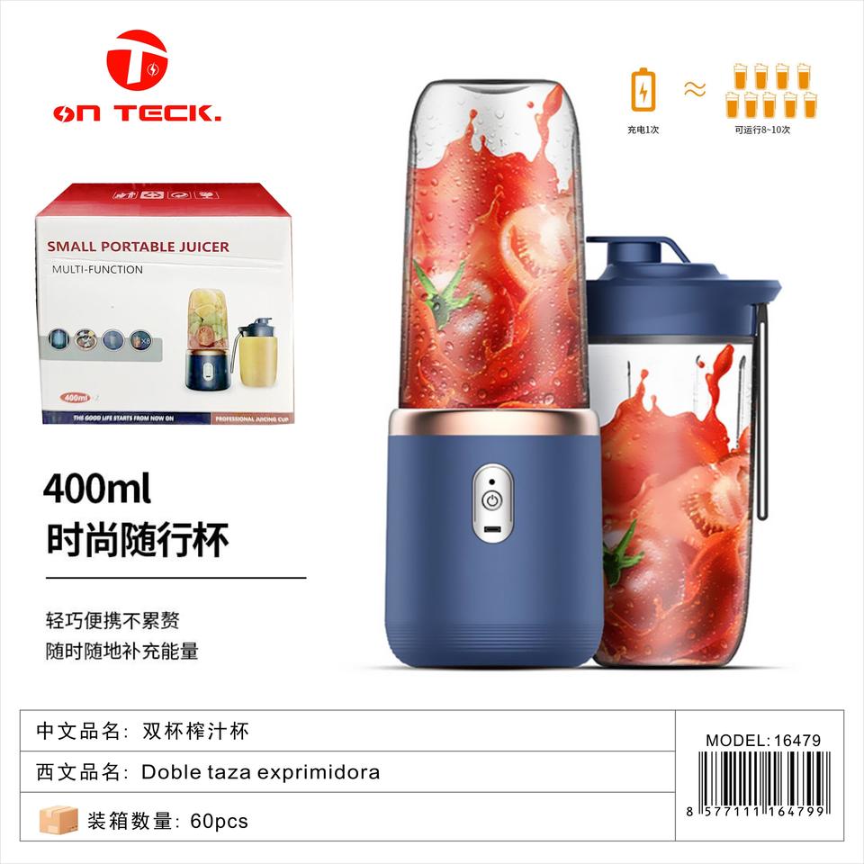 On Teck Dual Cup Juicer 0.4L Portable Blender Battery Operated Push Button Kitchen Appliance Plastic Housing 4 Blades