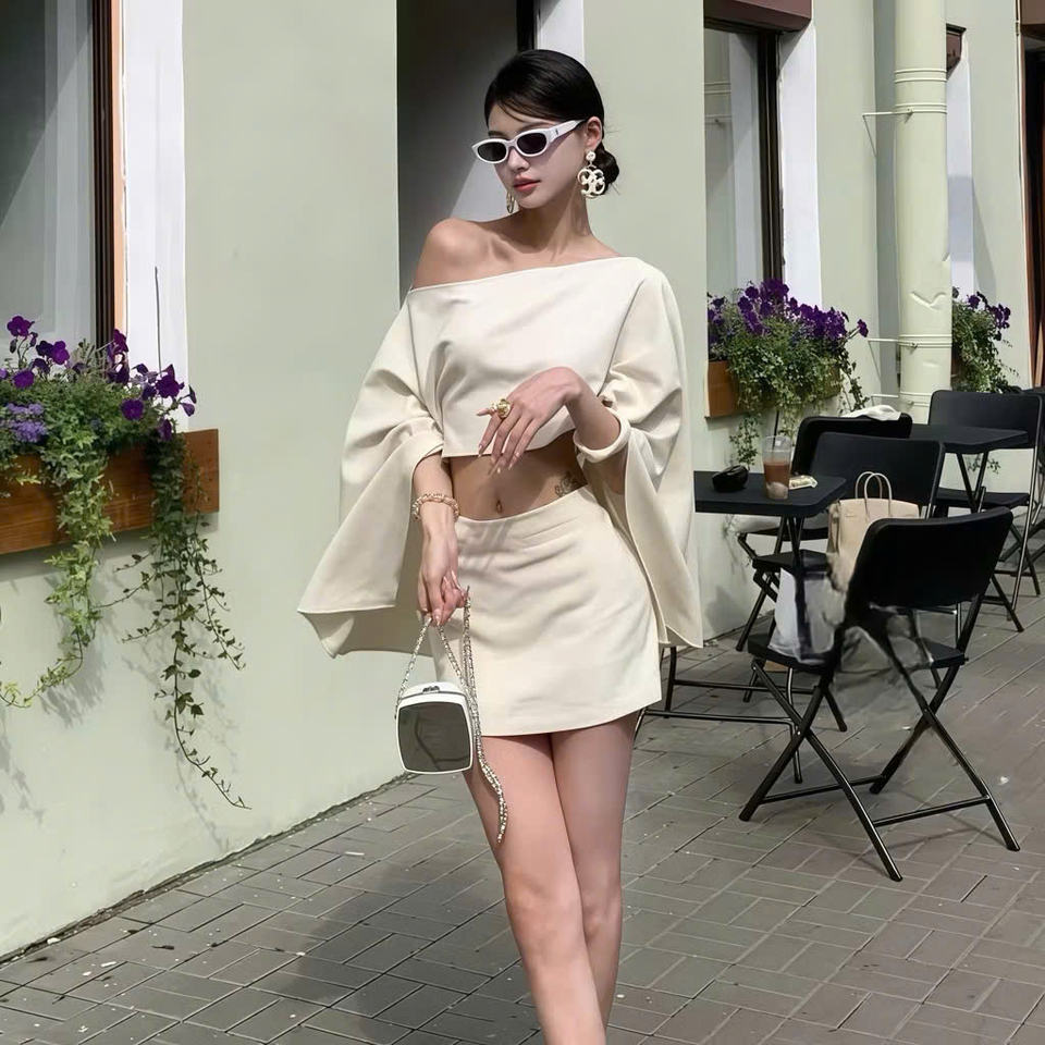 One shoulder flare sleeve blouse and mini skirt set women elegant outfit autumn winter chic streetwear party dress suit