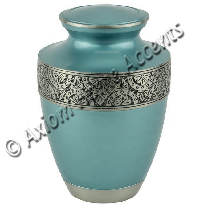 Online Top Selling Adult Brass Cremation Urn Hand Engraved With Aqua Pearl Color and Pewter Plated by Axiom Home Accents