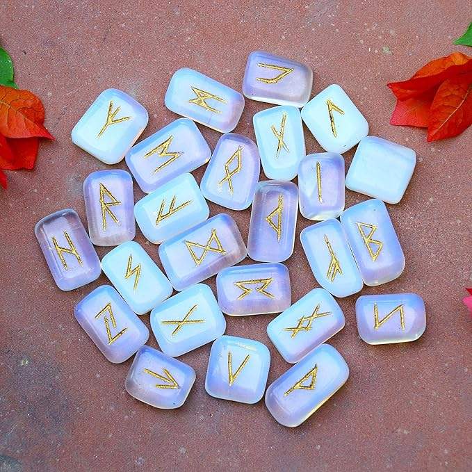 Opalite Rune Stones Set - Engraved Elder Futhark Alphabets for Divination & Beginners