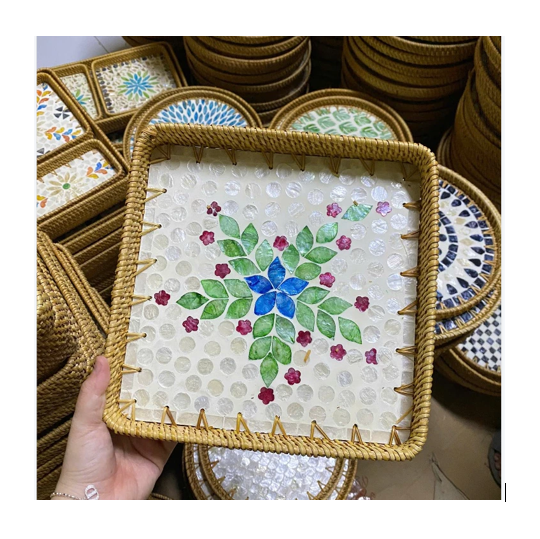 Opulent Artisan Rattan Tray Featuring Dazzling Mother Of Pearl Inlay Made In Vietnam Ideal For Interior Accent Pieces
