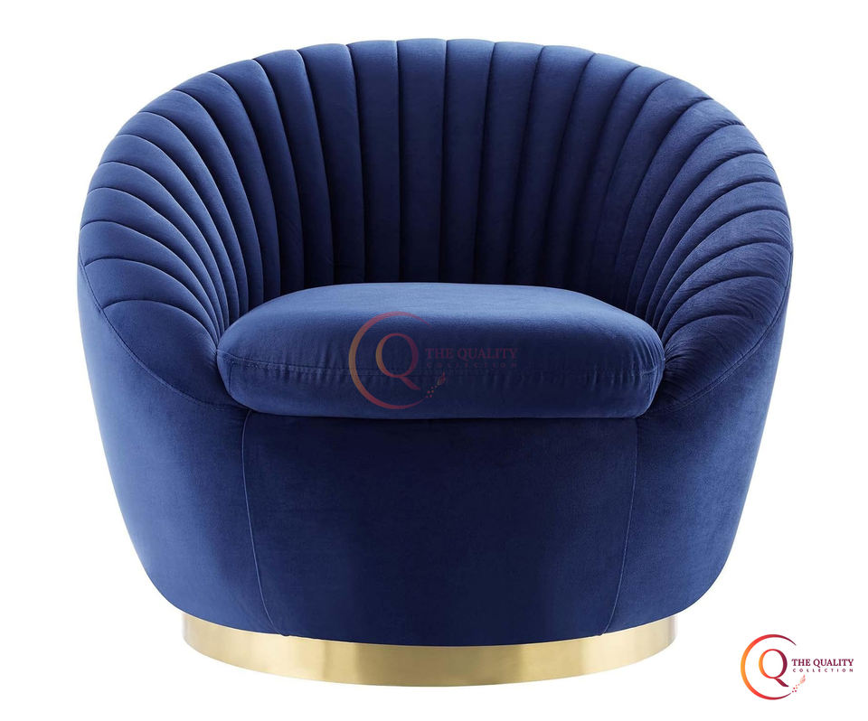 Opulent Serenity the Luxurious Blue Velvet Sofa Chair with Unique Shell Like Backrest and Vertical Tufting with Round Gold Base.