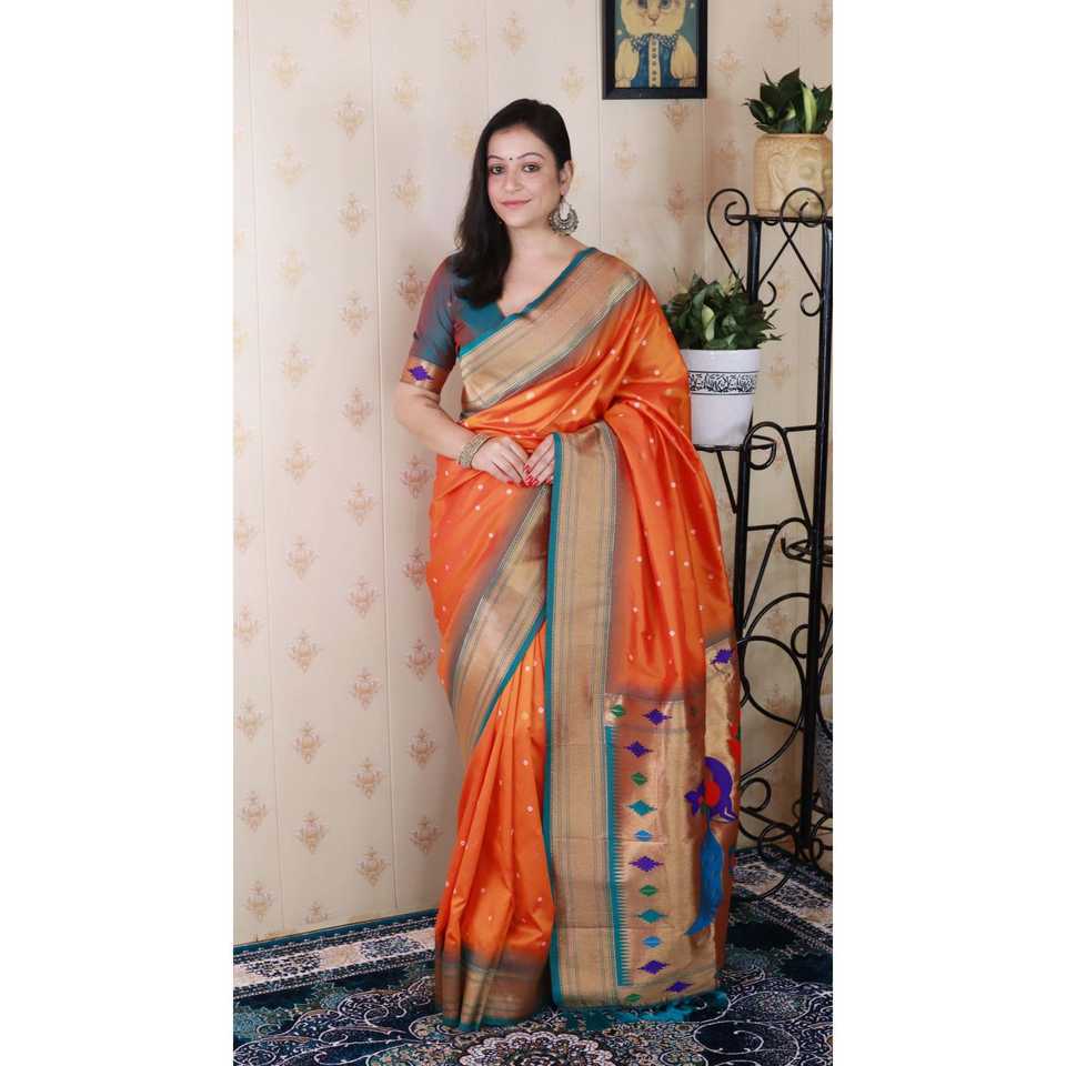 Orange Bandhani Paithani Silk Zari Woven Saree Traditional Indian Scarf & Shawl