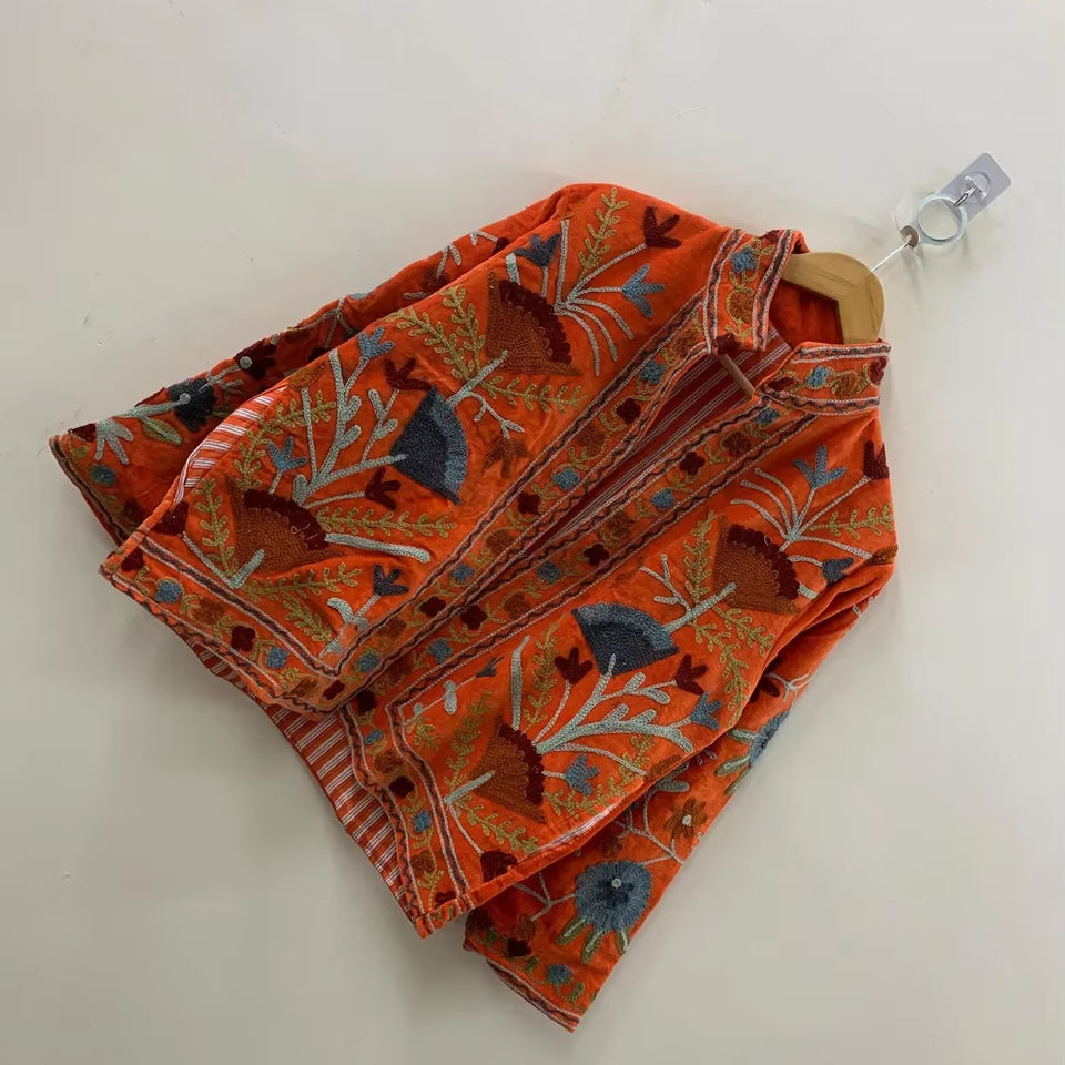 Orange Indian Suzani Embroidery Velvet Coat Suzani Boho Coat Unisex Spring Jacket Ethnic Luxury Outerwear