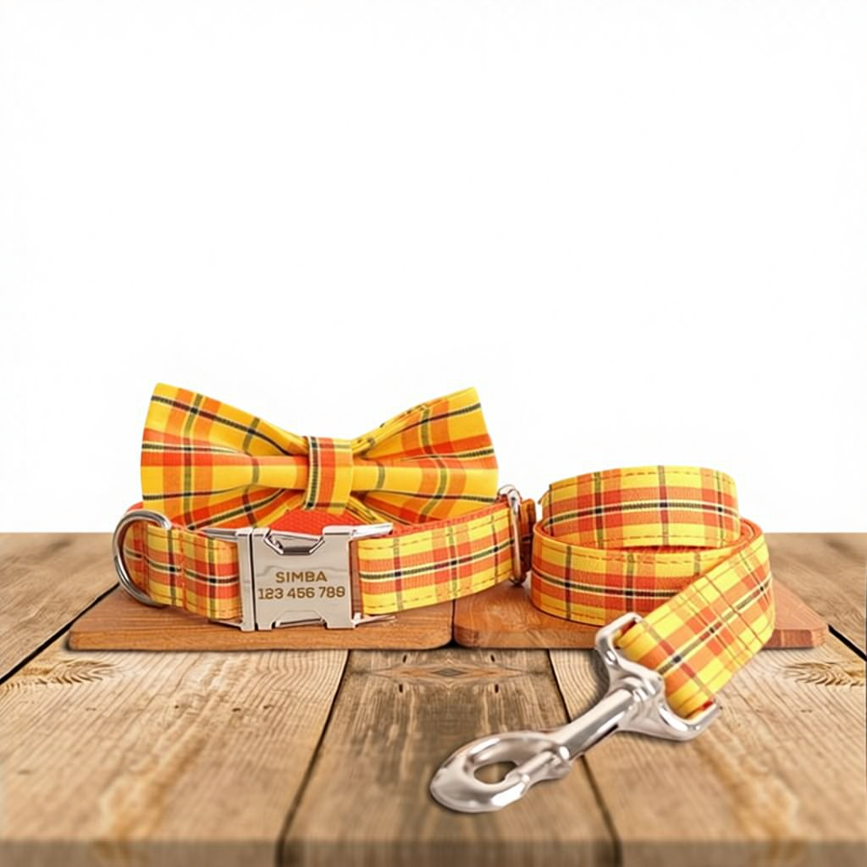 Orange Tartan Gingham Plaid Cotton Nylon Mix Fabric Custom Unisex Pet Collar for Cats Puppies & Dogs
