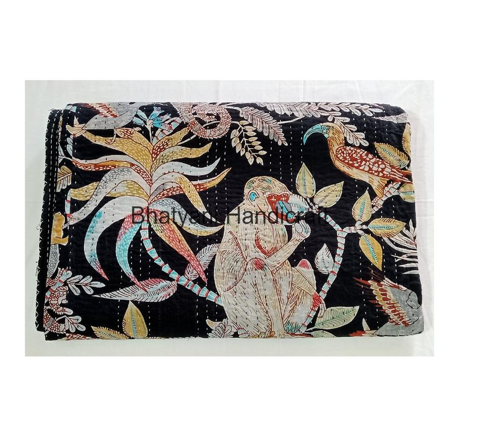 Orange Twin Size Monkey Print Kantha Quilt Soft Indian Cotton Bedding Handmade Kantha Throw for Hotel Decorative Bedspread