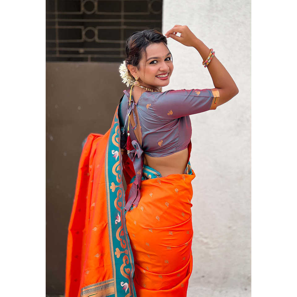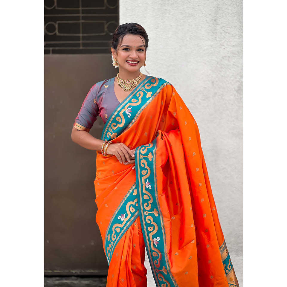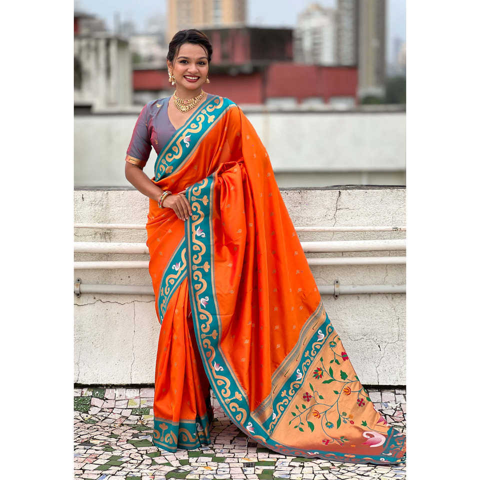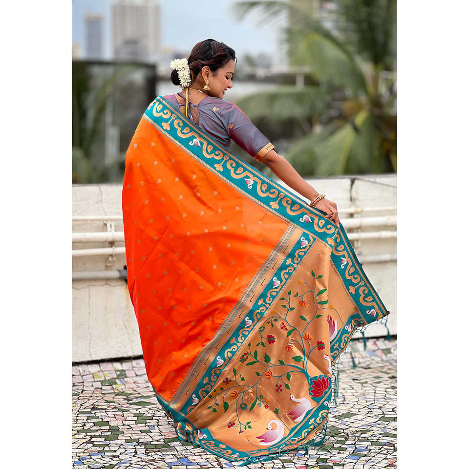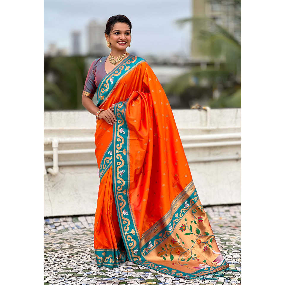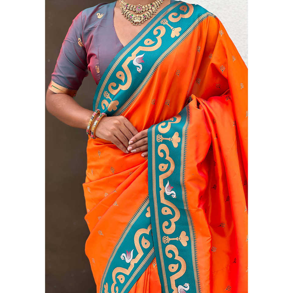 Orange Zari Woven Rajhans Swan Paithani Silk Saree Indian & Pakistani Clothing by Elite Weaves 650g