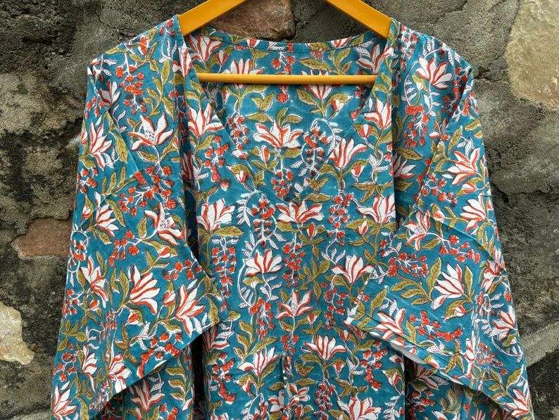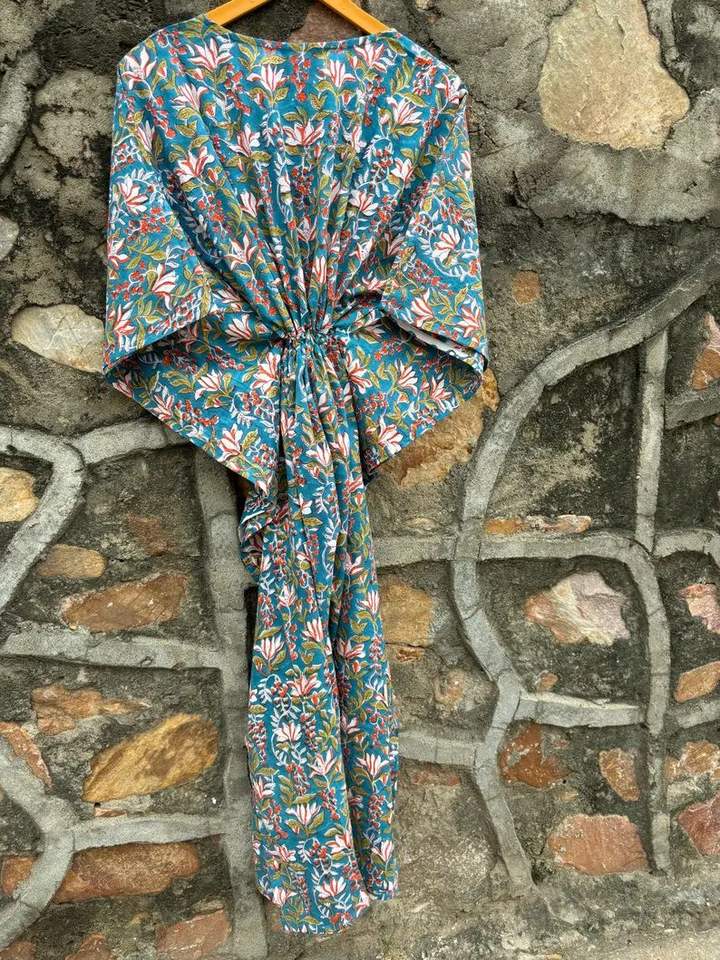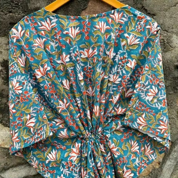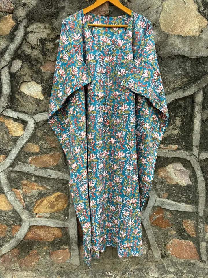 Organic Cotton Floor-Length Boho Caftan Top Women Ethnic Floral Block Print Summer Collection Bikini Cover Long Party Natural