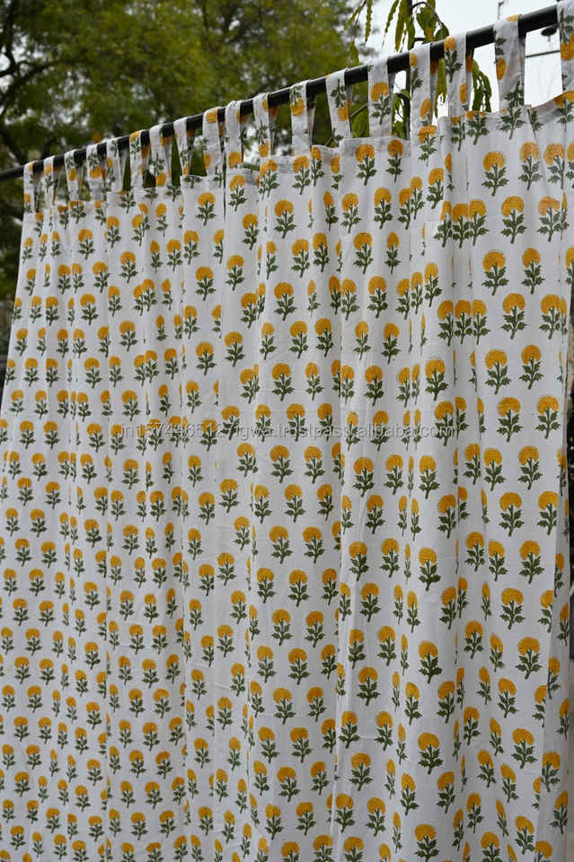 Organic Cotton Block-Printed Floral Curtains Handmade Country Style Rod Pocket with Tab Top & Tie Top for Living Room Valances