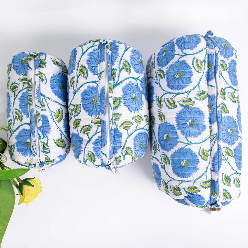 Organic Cotton Hand Block Printed Vintage Zipper Case Eco-Friendly Water Resistant Durable Makeup Utility Bag-Small/Medium Size