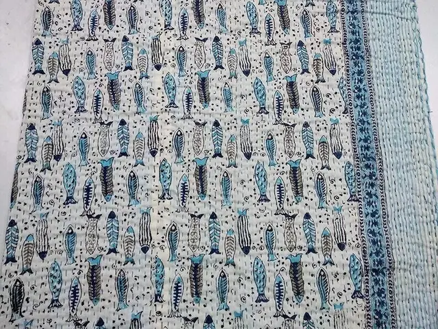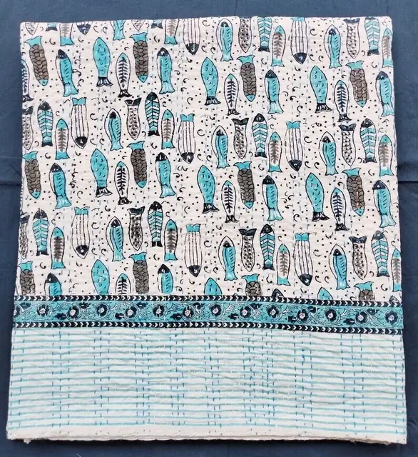 Organic Cotton Kantha Quilt Bohemian BOHEMIAN Handmade Quilt Fish Block Printed Bedspread Blanket for Hotels