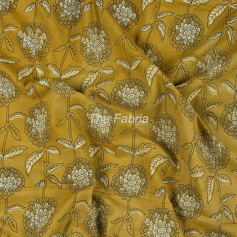 Organic Kalamkari Cotton Fabric Large Floral Greenish-Brown Print Handcrafted Home Decor Items-Curtains Outdoor Shirt Cover