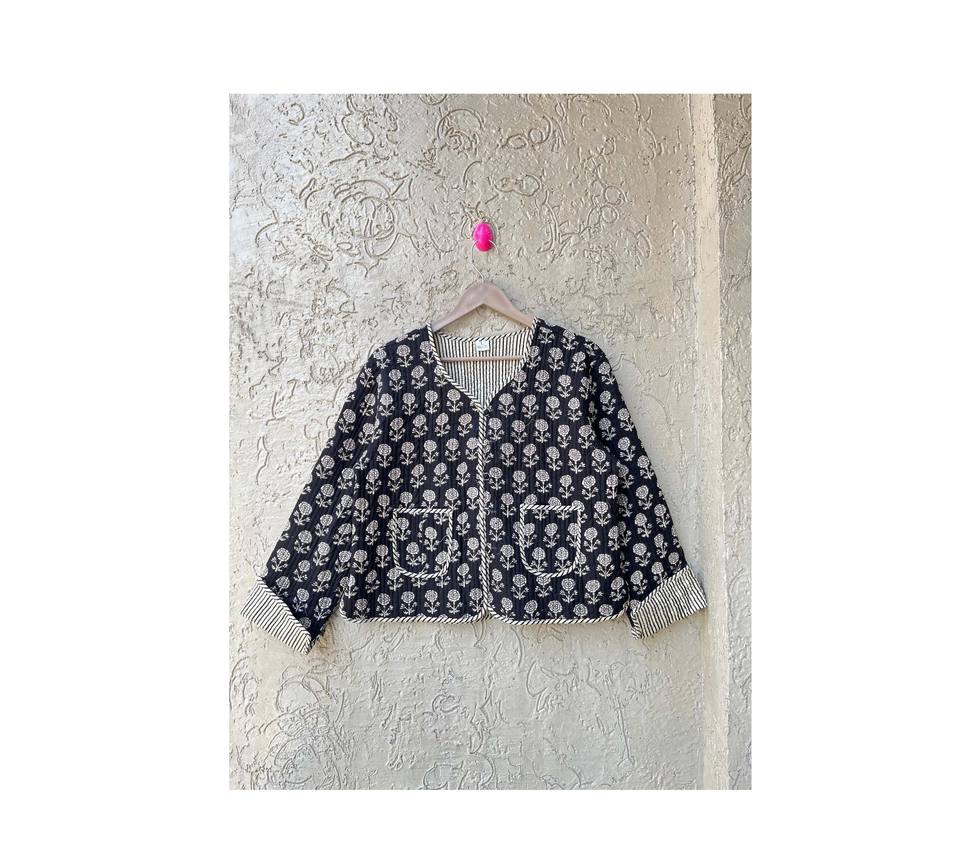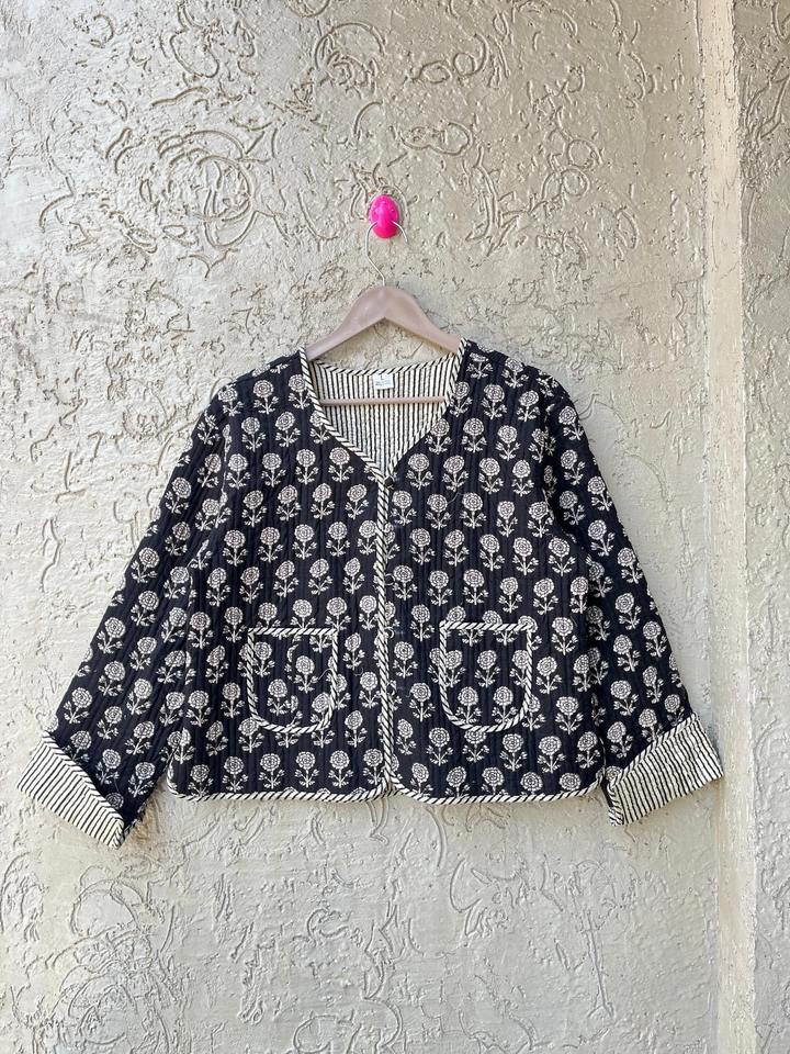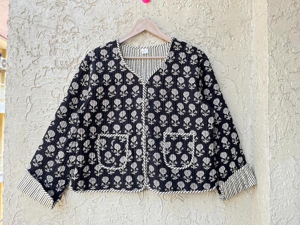 Organic Quilted Indian Cotton Kimono Jacket, Reversible Block Print Fabric, Blue warm Womens Jacket