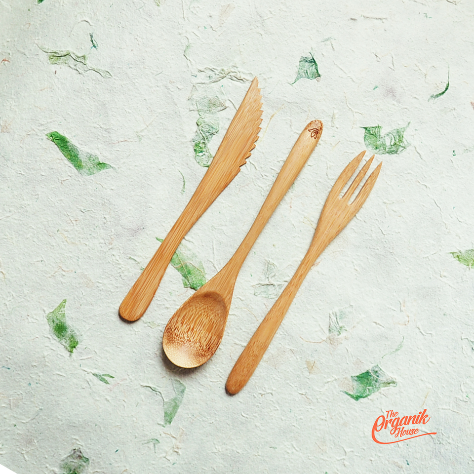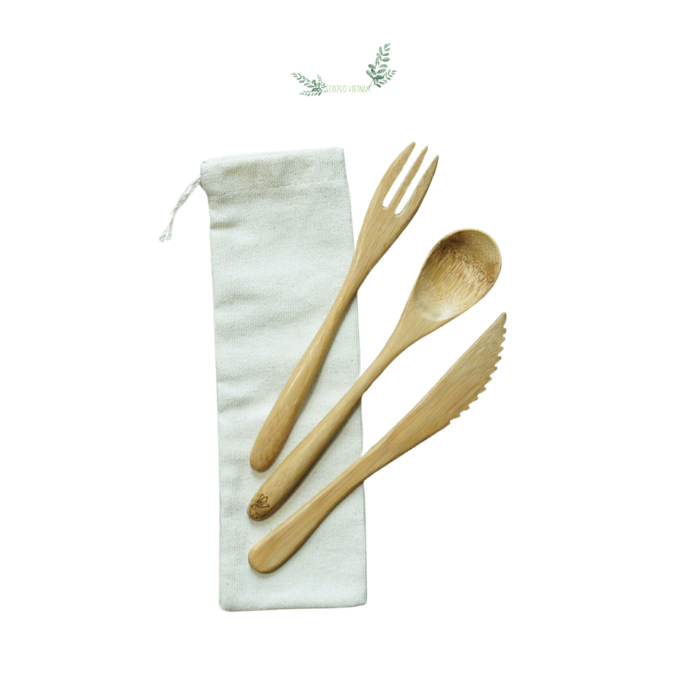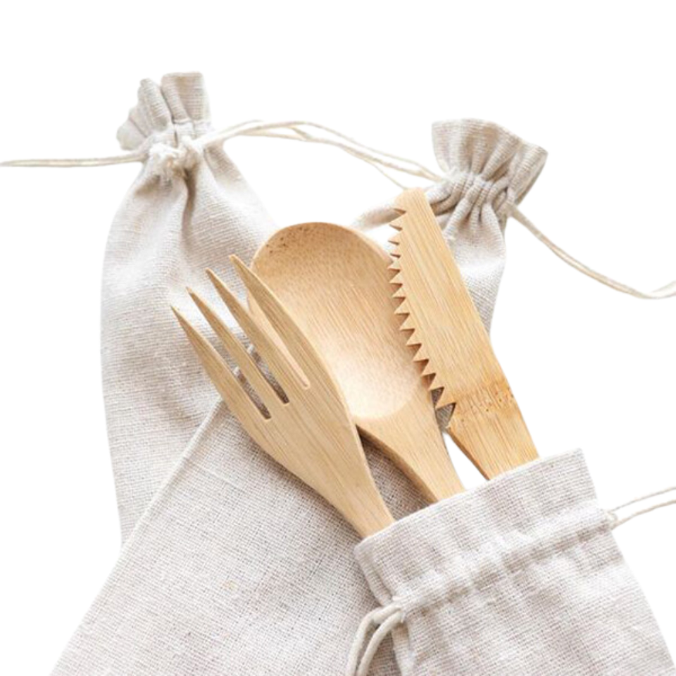 Organic Reusable Bamboo Cutlery Set for Travel, Packaged in a Box with a Fabric Pouch, Customized with Laser Logo