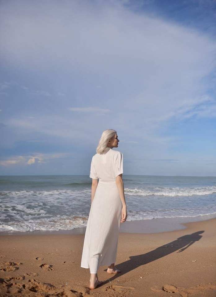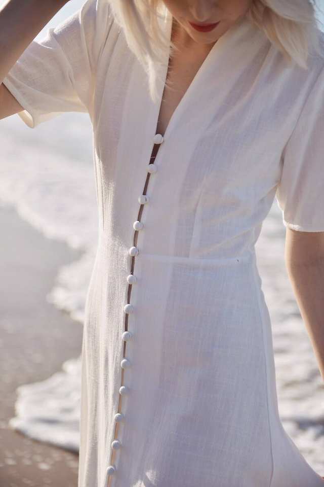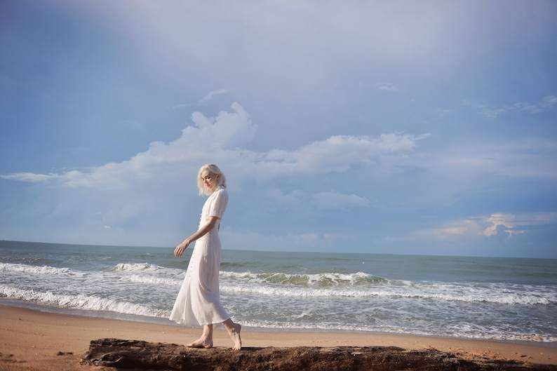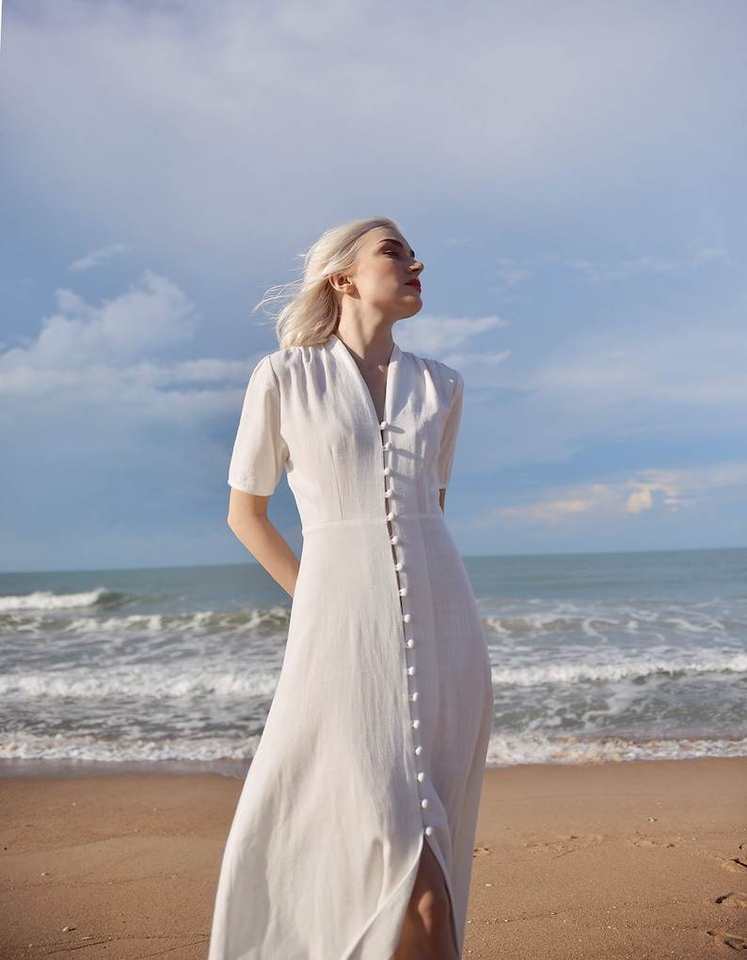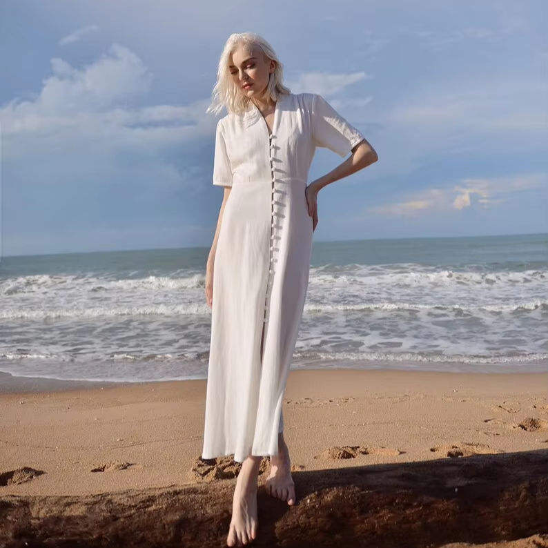Organic White Linen Dress with Sleeves Long Cotton Blend Style Elegant and Breathable Wedding Guest Dress