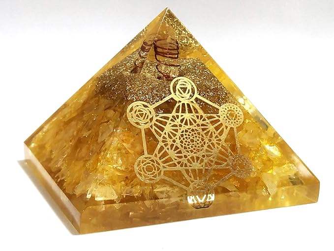Orgone Energy Pyramid with Natural Crystals - Citrine Crystal Orgone Pyramid with Sacred Metatron Grid - Manifestation Tool