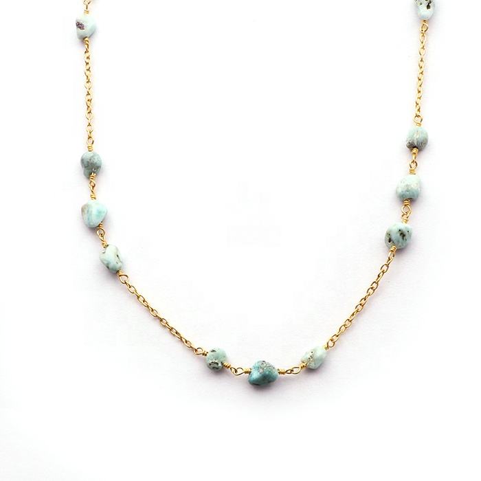 Original Larimar Tumble Beads Classic Necklace Gold Plated Wire Wrapped Smooth Polished 36 Inches Unisex Jewelry