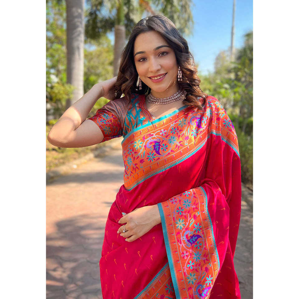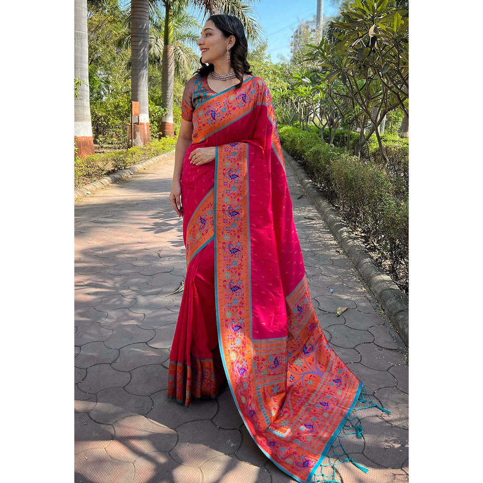 Original Meenakari Muniya Paithani Silk Zari Woven Saree Hot Pink Ethnic Scarf & Shawl