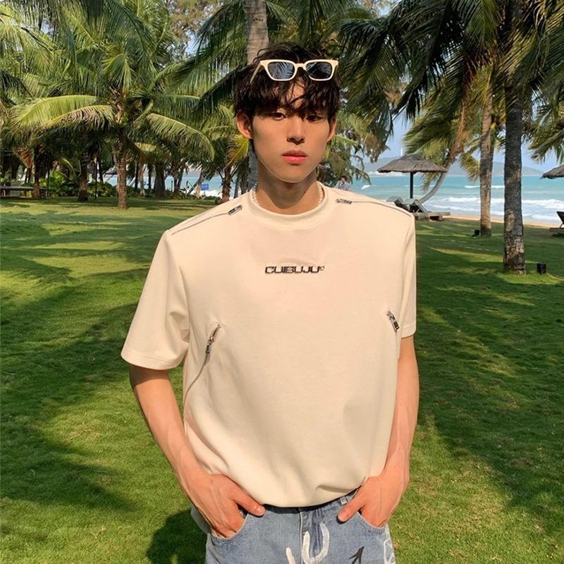 Original Metal Pad Short American High Street Zipper T-Shirt Unisex Round Neck Heavy Craft Design Straight Shoulder Five-Quarter