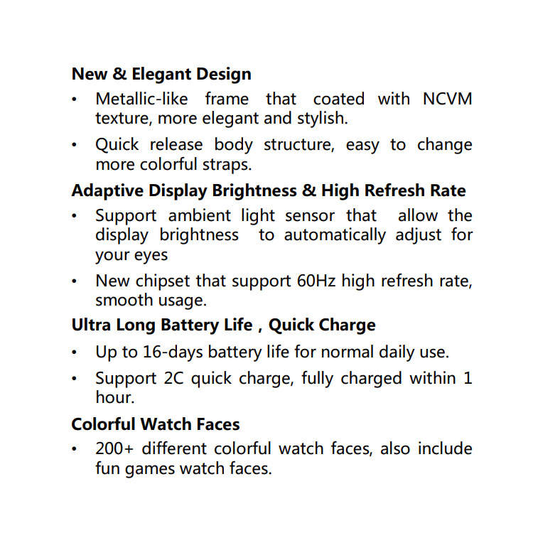 chronograph, THERMOMETER, Alarm Clock, Sleep Tracker, Speed Measurement, Fitness Tracker, Call Reminder, Answer Call, Push Message, Mood Tracker, Message Reminder, Heart Rate Tracker, Payment