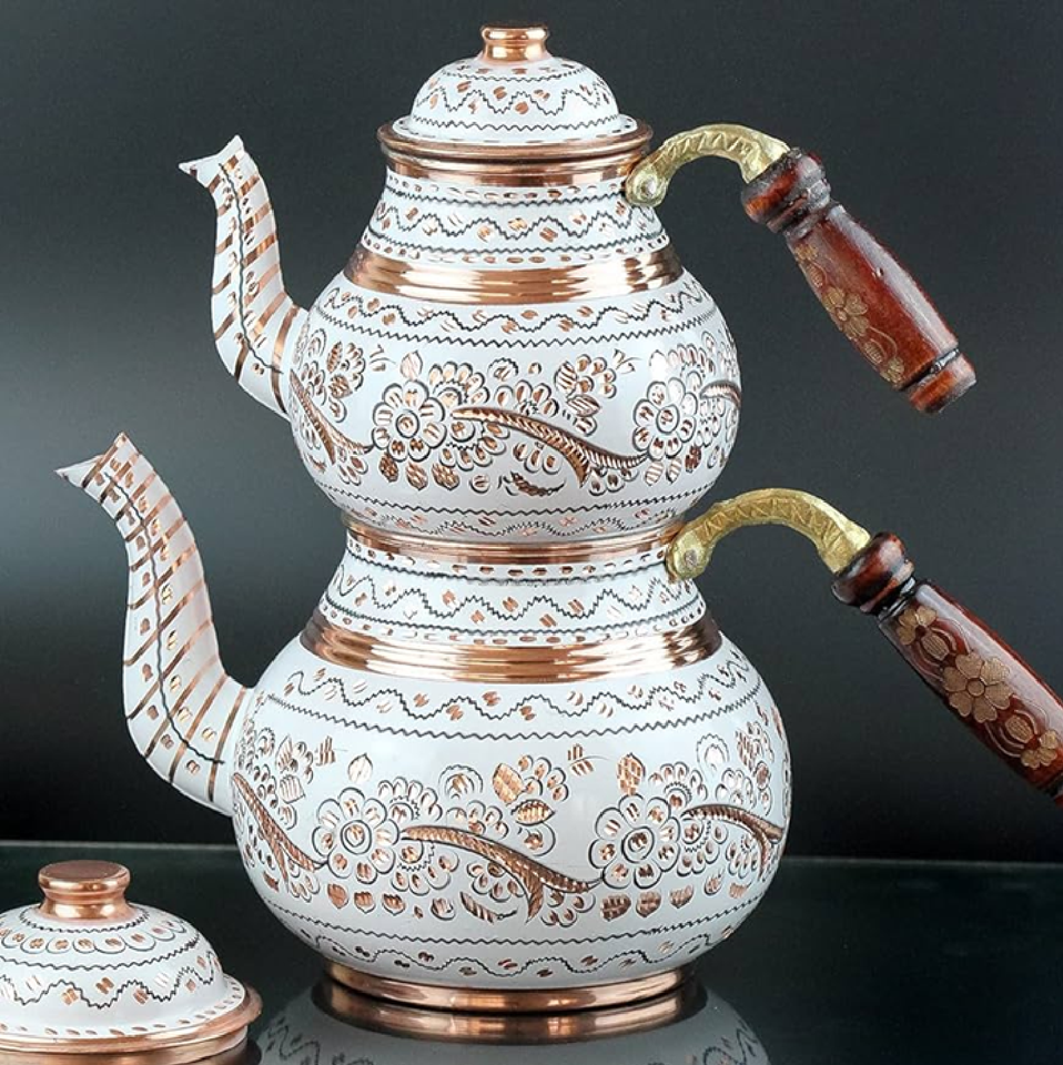 Ornate Moroccan copper metal teapot with embossed patterns & silver accents on a wooden table at Wholesale