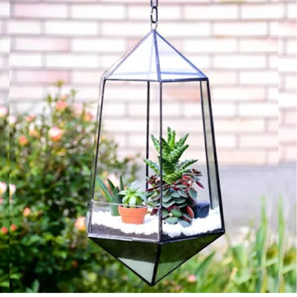 Ornate glass wardian case, black metal frame with gothic accents, ideal for miniature garden displays at Wholesale Factory Price