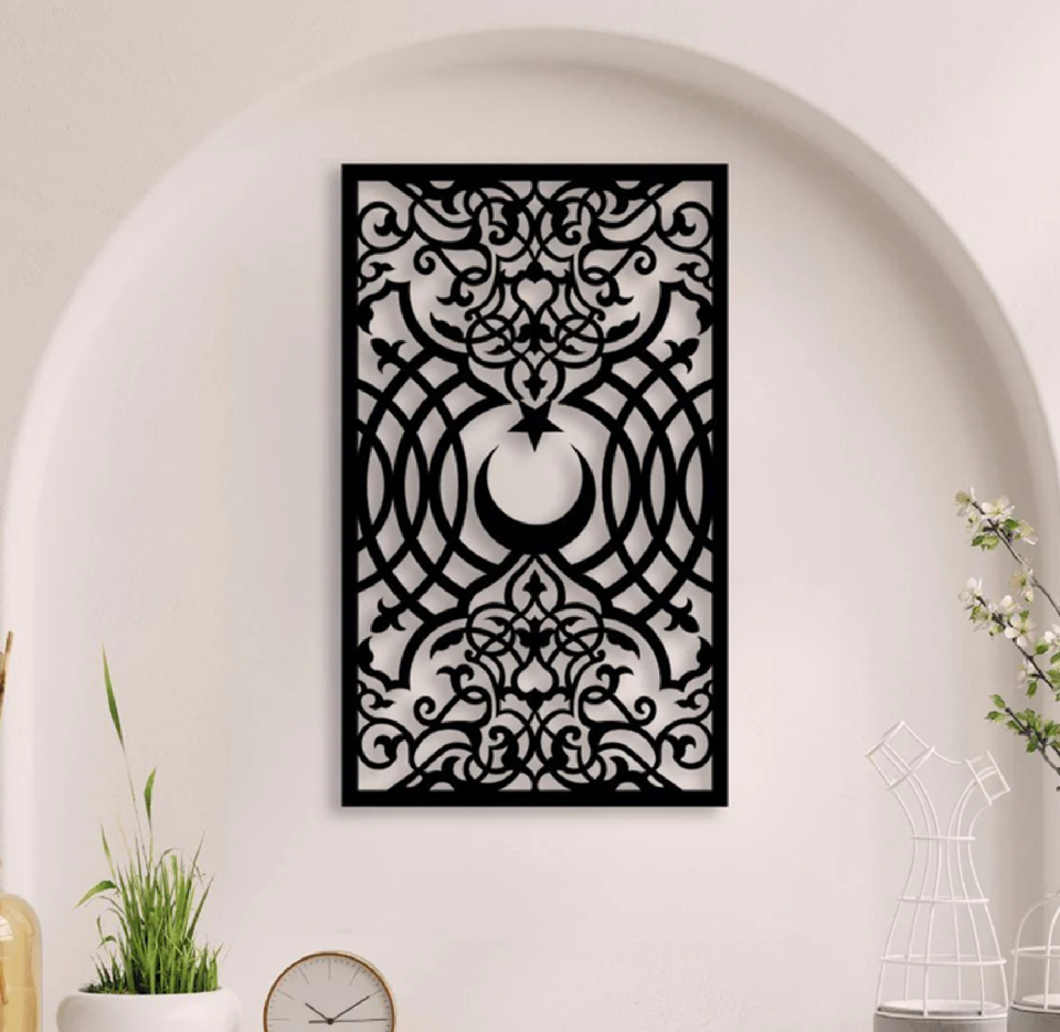 Ornate golden and blue wall art piece shaped like a flower displaying the 99 names of Allah in concentric patterns at Wholesale