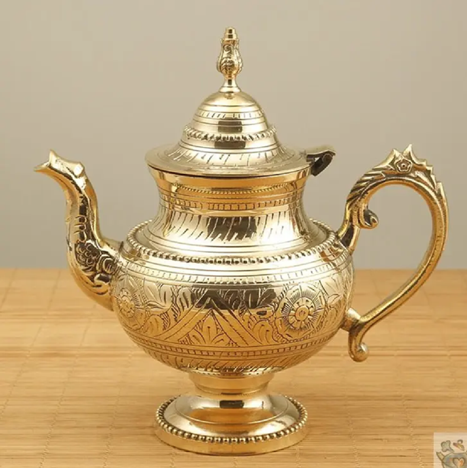 Ornate golden metal Moroccan style teapot, featuring intricate patterns and a regal presence at Wholesale