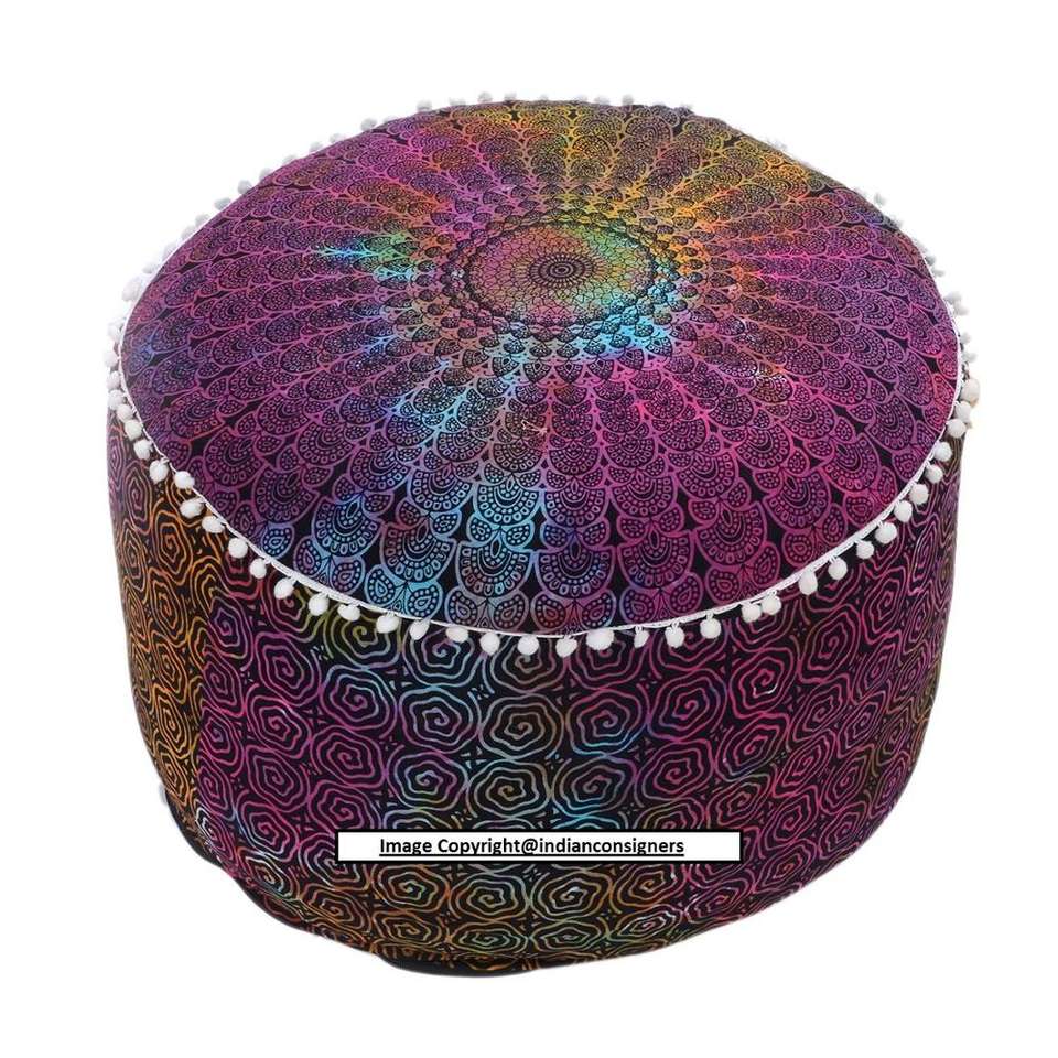 Ottoman Pouf Cover Peacock Mandala Puff Cover Footstool Bohemian Cotton Handmade Multiple Color Pouffe By Indian Consigners