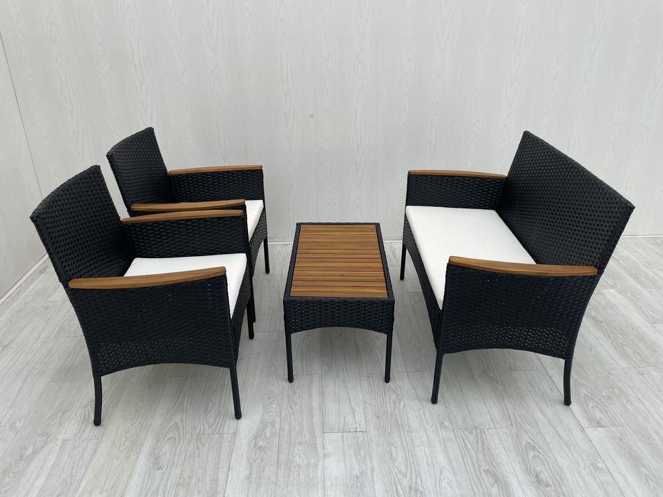 Outdoor 4 Pieces Rattan Sofa Conversation Set with Coffee Table and Chair, Black Wicker, Acacia Wood and White Cream Cushions
