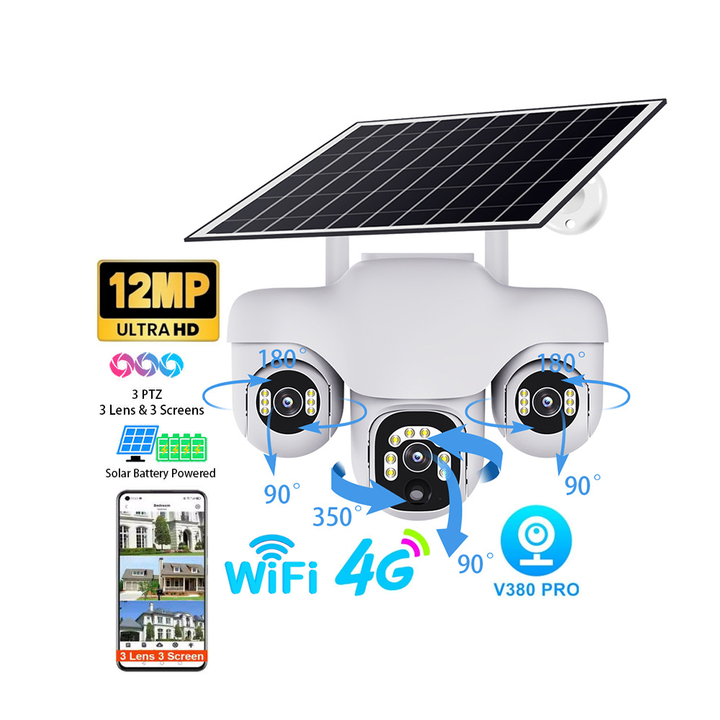 Outdoor 4G SIM Card 24H Recording Two-way Audio Night Vision Human Detection 12MP 3 Len Ptz CCTV Solar Network Security Camera