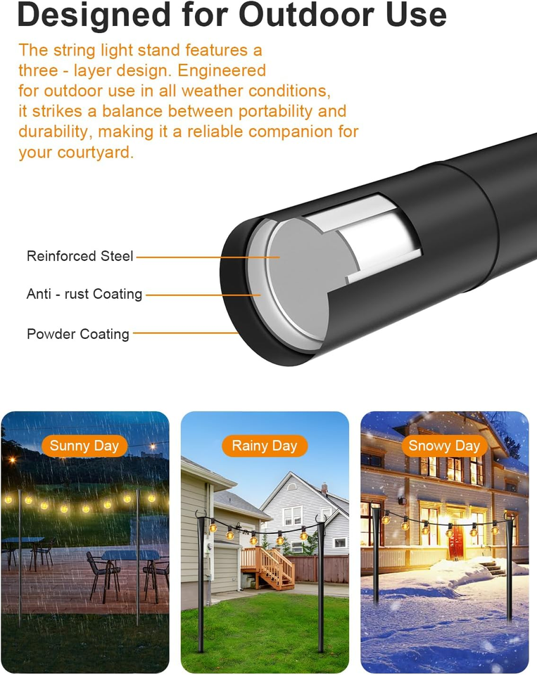 Outdoor Adjustable Heavy Duty Weatherproof Dual-Arm Powder-Coated Metal String Light Pole Stand for Garden Patio Backyard