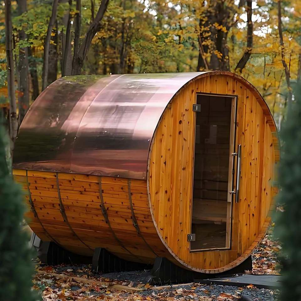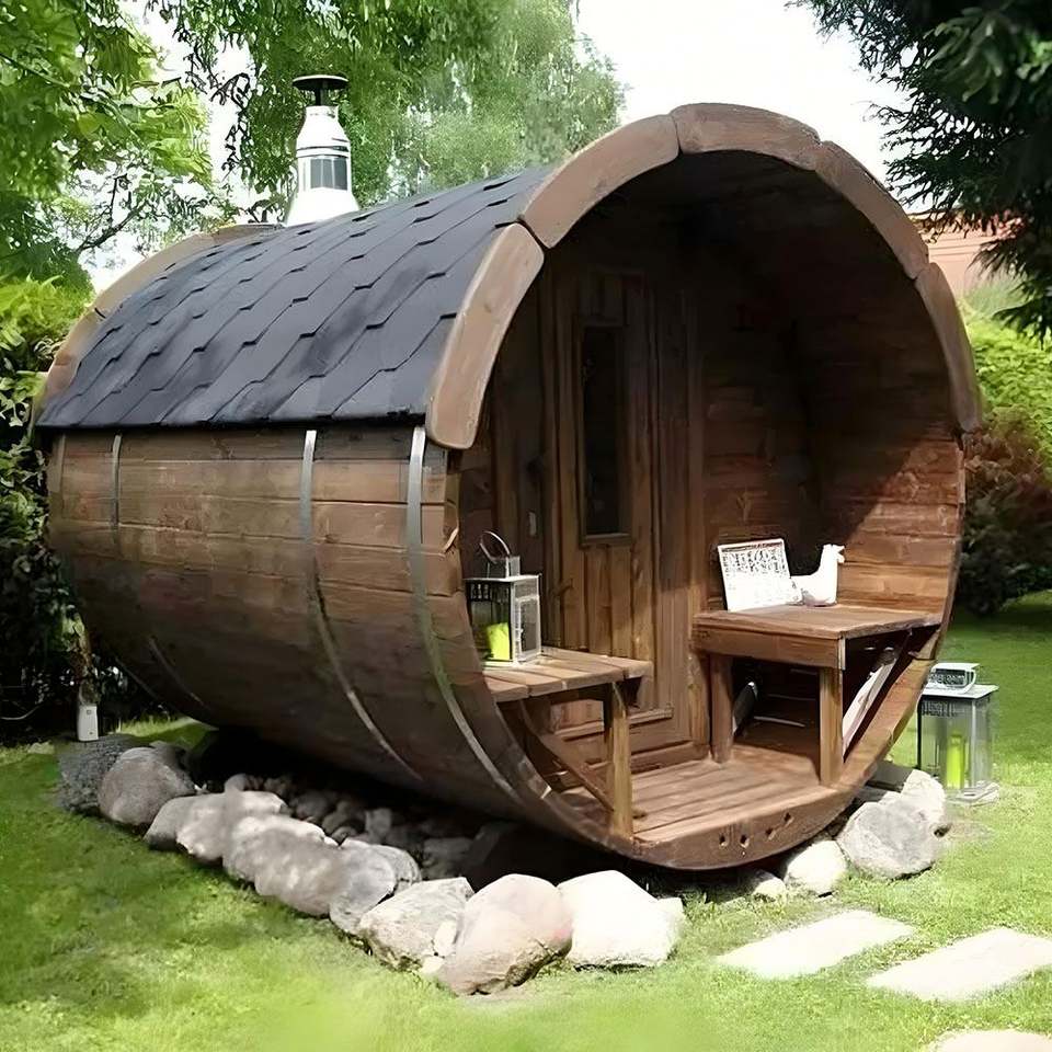 Outdoor Barrel-shaped Dry Sauna with Panoramic Glass Windows, Suitable for 4-6 People. a Barrel-shaped Wet Sauna Cabin.