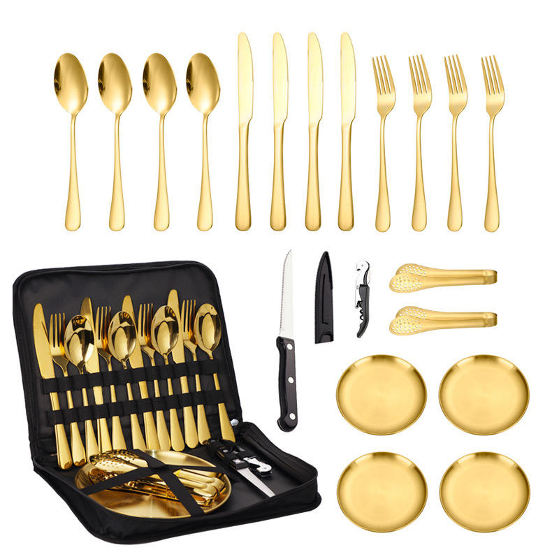 Outdoor Camping Cutlery Set 4 Person Stainless Steel Portable Picnic Tableware With Case Gold Finish