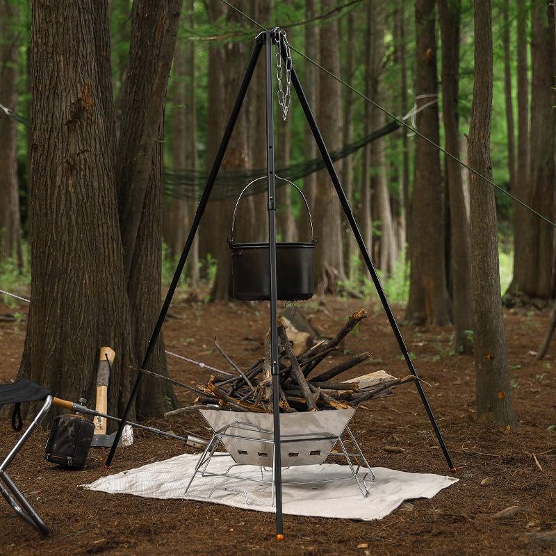 Outdoor Camping Tripod Aluminum Alloy Adjustable Height Hanging Pot Rack For Fire Cooking Black Triangle Shape