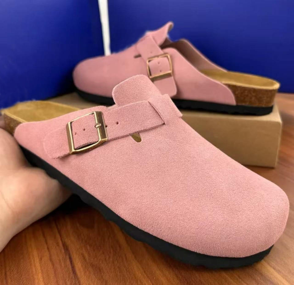 Outdoor Flat Sandal Mules Clog Real Leather Suede Women's Cork Foot Bed Solid Clog