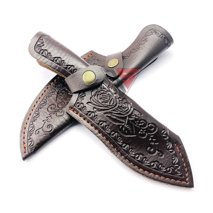 Outdoor New Camping Hunting Knife Embossed Design Leather Sheath For Fix Blade,Strap Closing,Brass Press Stud Button,Belt Loop