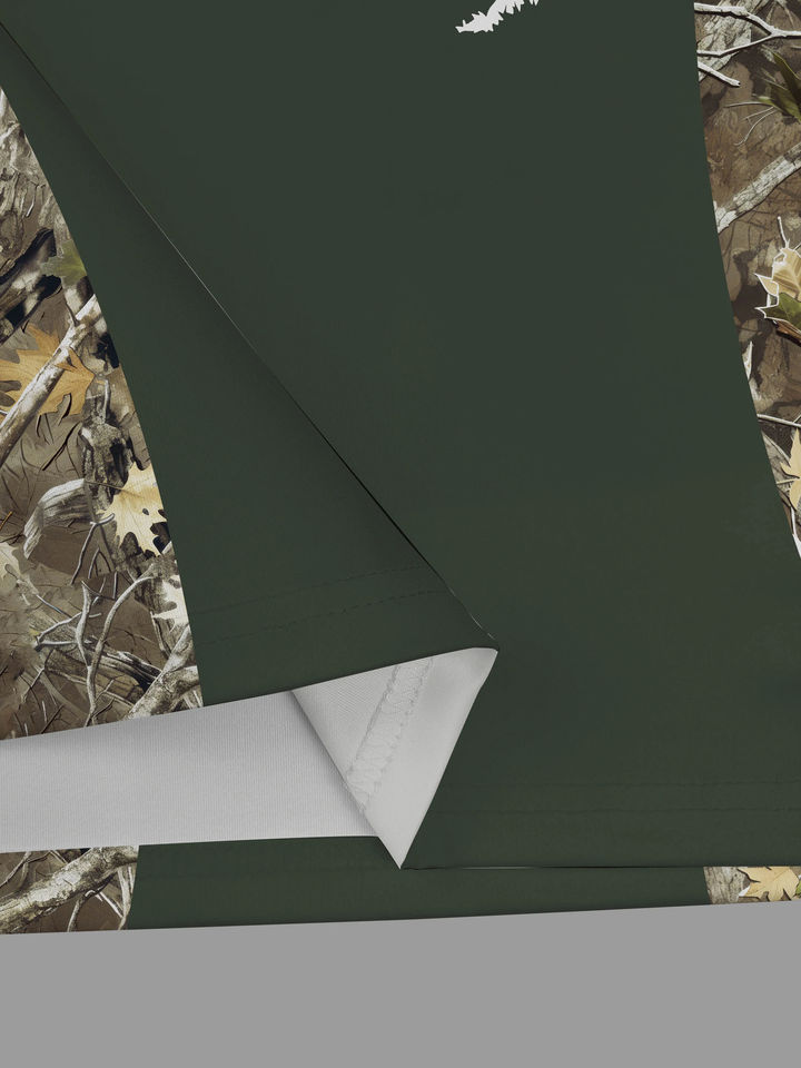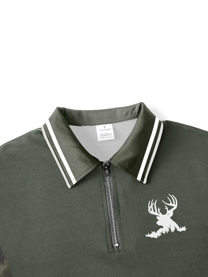Outdoor Style Camouflage Stitching Polo Shirt Half Zipper Deer Head Print Top Men's Casual Hunting Style Short Sleeves