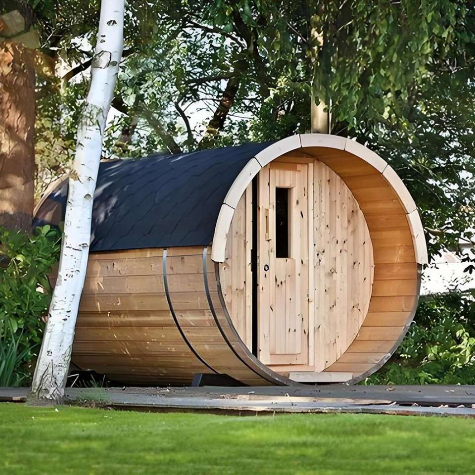 Outdoor Traditional Cylindrical Sauna Room Steam Room Made of Cedar and Fir Wood, Heated by Electric Stove in Sauna Room