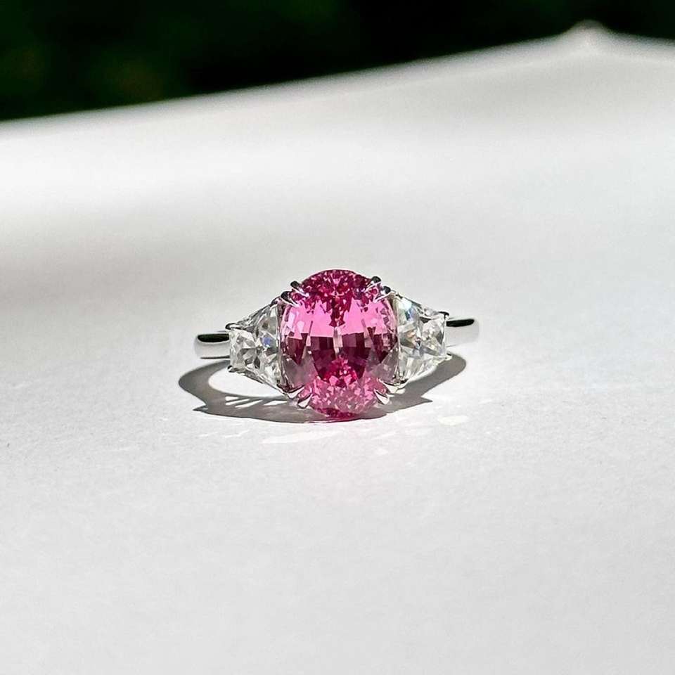 Oval Cut 4.85 Carat Pink Sapphire Ring with Trapezoid Cut Side Stones in 925 Silver Unique Three Stone Engagement Promise Ring