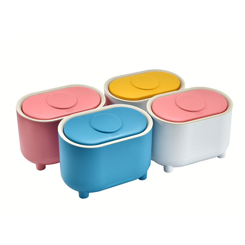 Oval Desktop Trash Can Small Size Lidded Storage Bin Push Button Type For Indoor Use Blue White Pink Yellow Colors